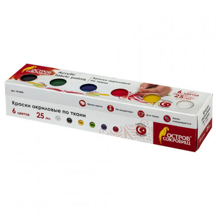 Акриловые краски ОСТРОВ СОКРОВИЩ отлично подойдут для рисования и оформительских работ. Обеспечивают быстрое высыхание без изменения цвета. Используются для любительской росписи по ткани. В наборе 6 ярких и насыщенных цветов: белый, красный, синий, черный, желтый, зеленый. Краски обладают высокой кроющей способностью, отлично смешиваются, не тускнеют после высыхания и не выгорают при воздействии солнечных лучей. Правила ухода за изделием после нанесения краски:-для закрепления рисунка ткань необходимо прогладить с обратной стороны после высыхания краски;-температура стирки 30 - 40 градусов С;-умеренная концентрация нейтральных моющих средств (порошок) без отбеливателей;-после стирки не выжимать скручиванием;-при стирке руками места, где нанесена роспись, не тереть;-перед стиркой изделие лучше вывернуть наизнанку;-сушить в расправленном виде;-не подвергать предварительной стирке (замачиванию);-гладить щадяще и с изнаночной стороны. Тип товара: краски. Тип краски: матовые акриловые по ткани. Количество цветов в