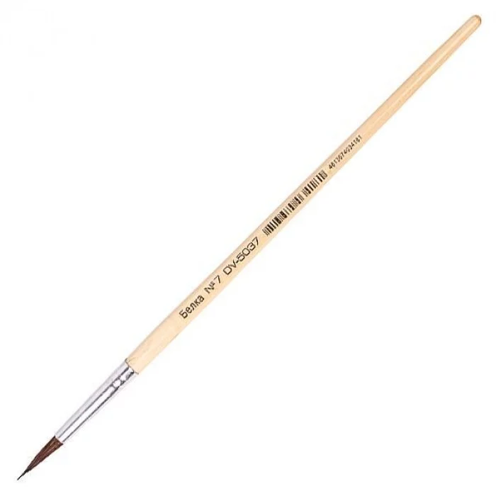 Кисть № 7 белка "Darvish" Длина кисти 21,3см Беличья кисть прекрасно держит форму, не ломается, хорошо впитывает влагу и легко моется под струёй воды. При соприкосновении с бумагой и другими поверхностями (фарфором, фаянсом, деревом), волоски не разъединяются и ведут чёткую линию, без "полос" . Упаковка 30шт-кар. кор. Размер :23,5*3*3,5см