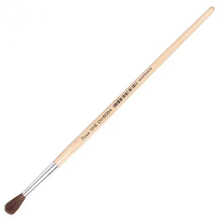 Кисть № 8 пони "Darvish" Идеальны для начинающих художников и их часто используют в детских образовательных учреждениях. Преимущества: надёжность, долговечность (крепкий толстый волос). Используют в основном для красок: акварель, гуашь, темпера, а также клей и косметические цели.