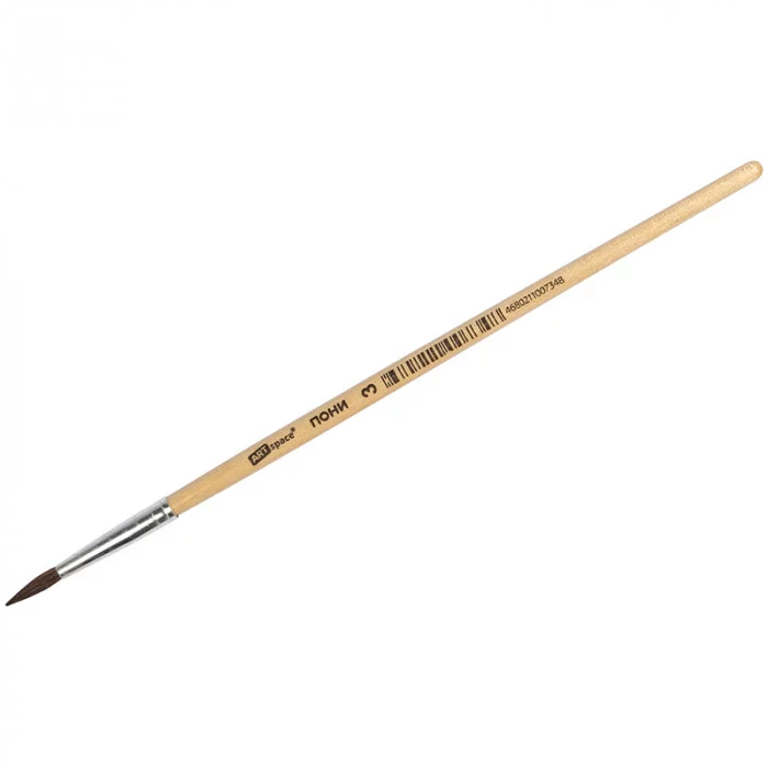 Художественные кисти ArtSpace изготовлены из волоса пони. Он несколько толще, чем у белки, расстояние между волосками больше, поэтому воду такая кисточка набирает меньше, чем из белки или колонка. Приобретают форму конуса, не слишком упруги. Кисть круглой формы с короткой ручкой из дерева идеальна для начинающих художников, поэтому её часто используют в детских образовательных учреждениях. Волос: пони; Номер: 3; Форма кисти: круглая; Тип ручки: короткая; Материал ручки: дерево.