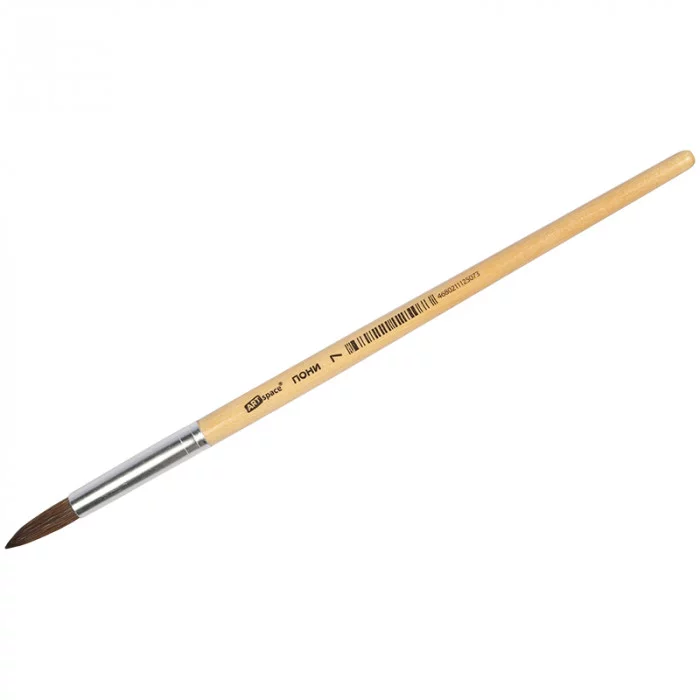Художественные кисти ArtSpace изготовлены из волоса пони. Он несколько толще, чем у белки, расстояние между волосками больше, поэтому воду такая кисточка набирает меньше, чем из белки или колонка. Приобретают форму конуса, не слишком упруги. Кисть круглой формы с короткой ручкой из дерева идеальна для начинающих художников, поэтому её часто используют в детских образовательных учреждениях. Волос: пони; Номер: 7; Форма кисти: круглая; Тип ручки: короткая; Материал ручки: дерево.