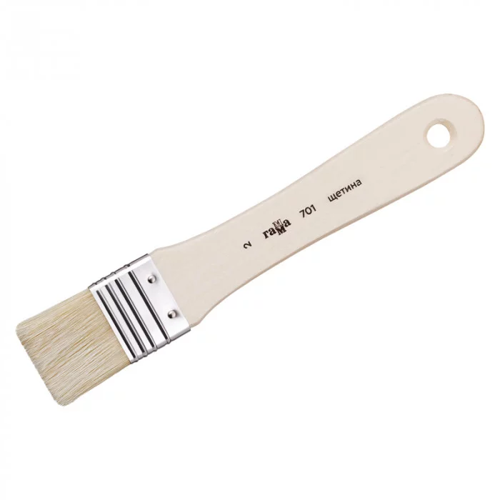 Флейц – плоская кисть, предназначенная для нанесения широких слоёв краски одним мазком и свободной живописи заливками. Изделия универсальные, подходят для всех видов живописи и декоративных работ, способны удерживать большое количество краски; всего несколькими движениями можно создавать большие по площади фактуры. Волос, используемый в производстве флейцев, прошёл специальную обработку, исключающую выпадание волосков кисти, идеально сбалансирован в соотношении жёсткости и эластичности. Кисть имеет никелированную бесшовную обойму. Номер: 2; Форма кисти: плоская; Волос: щетина; Тип ручки: длинная; Ширина волосяного пучка: 33,5; Выставка: 34.