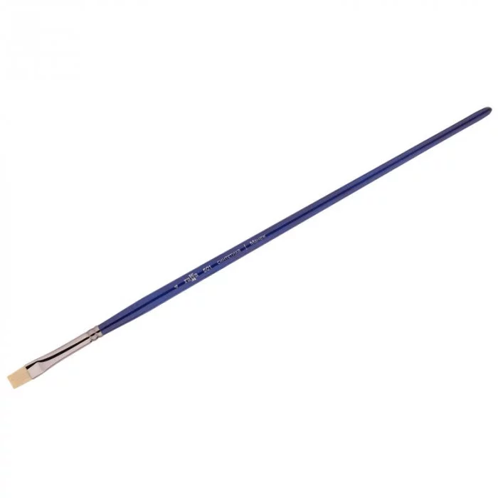 Художественные кисти ГАММА серии «Манеж» изготовлены из высококачественного синтетического волоса, имитирующего натуральный ворс щетины. Данные кисти предназначены для работы с масляными, акриловыми, гуашевыми красками, медиумами, лаками и пастами. Удобны для нанесения структурных мазков. Форма пучка круглых кистей в виде конуса с идеальным зауженным кончиком позволяет писать крупными, плотными мазками, а также вести тонкую и изящную линию. Длинная глянцевая ручка, окольцованная никелированной обоймой, даёт возможность лучше контролировать работу кисти. Белый цвет волоса позволяет более точно отслеживать чистоту оттенка краски, что увеличивает качество работы с точки зрения колористики, а новый подход к технологии создания синтетики увеличил эластичность и упругость материала. Данные кисти являются полноценной заменой кистям из натуральной щетины. Длинная ручка кисти покрыта глянцевым лаком цвета ультрамарин. Кисть имеет никелированную бесшовную обойму и цветную лакированную ручку. Номер: 4; Форма кисти: плос