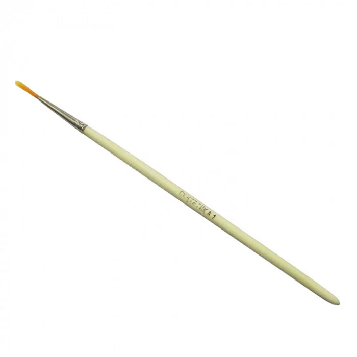 Кисть круглая из синтетического волоса №1. Аналог натурального волоса, параметры мягкости и эластичности практически эдентичны, напоняемость краской немного ниже. Пучок надежно вклеен в металлическую обойму. Обойма закреплена на деревянной ручке двойным о