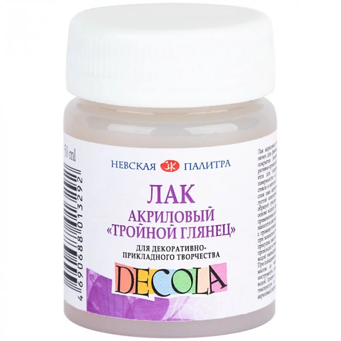 Акриловый лак "Тройной глянец" на водной основе используется для завершения работ, выполненных акриловыми красками. Часто применяется при росписи различных поверхностей. Используется для работы с поверхностями из дерева, картона, пластика, стекла и металла. Не имеет запаха. Создаёт прочную плёнку, которая защищает поверхность от воздействия внешней среды и придаёт работе законченный вид. Создает эффект "глазури", обладает густой консистенцией и не растекается. Не образует трещин после высыхания. Лак на основе водной акриловой дисперсии. Перед использованием лак необходимо тщательно перемешать. Наносится кистью в один или несколько слоёв с промежуточной сушкой не менее 24 часов при комнатной температуре.Глянцевый акриловый лак отлично подойдет как для начинающих художников, так и для профессионалов своего дела. Тип товара: лак. Серия: Декола. Объём: 50 мл. Цвет: прозрачный. Упаковка: пластиковая банка. Эффект покрытия: глянцевый Бренд - НЕВСКАЯ ПАЛИТРА. Производитель - Россия. Артикул - 5828961. Штрихкод -