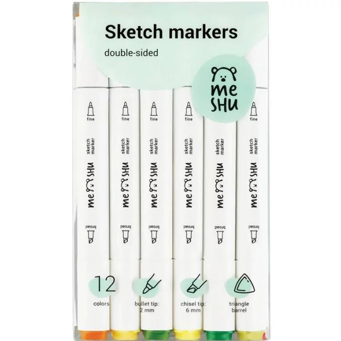Набор двусторонних маркеров для скетчинга Meshu - идеальный выбор для художников, дизайнеров, иллюстраторов и любителей скетчинга, подходят для создания анимэ и манги. Эргономичный трехгранный корпус удобно лежит в руке и позволяет эффективно прорабатывать мелкие детали рисунка. Чернила на спиртовой основе - быстро высыхают, водостойкие, нетоксичны и не портят поверхность бумаги. Маркеры обладают пулевидным (2мм) и скошенным (6 мм) наконечниками, что позволяет прорабатывать как мелкие детали рисунка. так и закрашивать большие области.