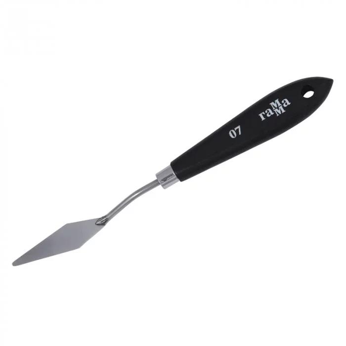 Паяный мастихин из нержавеющей стали с удобной плоской ручкой из натурального бука. Сварное соединение ручки и лезвия дает больший угол наклона мастихина к холсту, снижая вероятность случайного касания и смазывания краски. Форма лезвия — ромб. размер рабочей поверхности мастихина-56мм*11мм