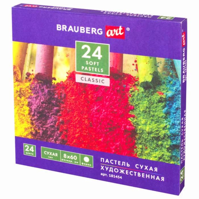 Сухая художественная пастель BRAUBERG ART "CLASSIC" предназначена для графики и живописи. Она отличается насыщенностью цвета, мягким письмом и не крошится при использовании. Пастель подходит как для начинающих художников и любителей, так и профессионалов. Легко ложится на различные фактуры цветной бумаги, бумагу для рисования, холст, картон, дерево, керамику. Также можно наносить на влажную поверхность или размывать водой для достижения акварельного эффекта. 24 цвета позволяют полностью передать цветовую палитру. Высокое качество пигментов и связующего обеспечивает низкий расход материала, хорошую укрывистость и яркость цвета. Пастель имеет вид брусков с круглым сечением, обёрнутых в бумажную обёртку. Она позволяет сохранять руки и одежду чистыми. Не токсична и безопасна при использовании. При попадании на одежду или кожу рук легко смывается тёплой водой. Благодаря компактной упаковке удобно брать с собой.Художественная пастель пригодится как канцтовары школьникам, студентам, участникам мастер-классов, ученик